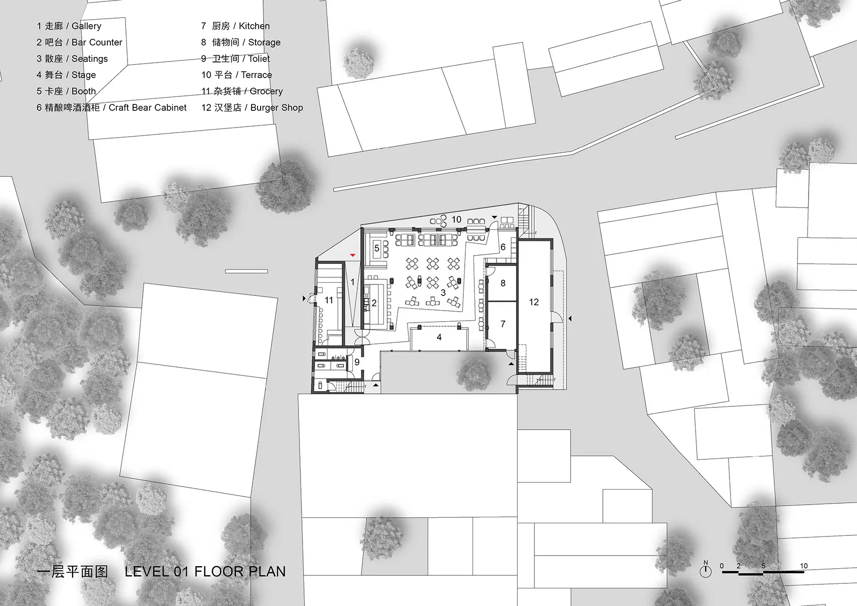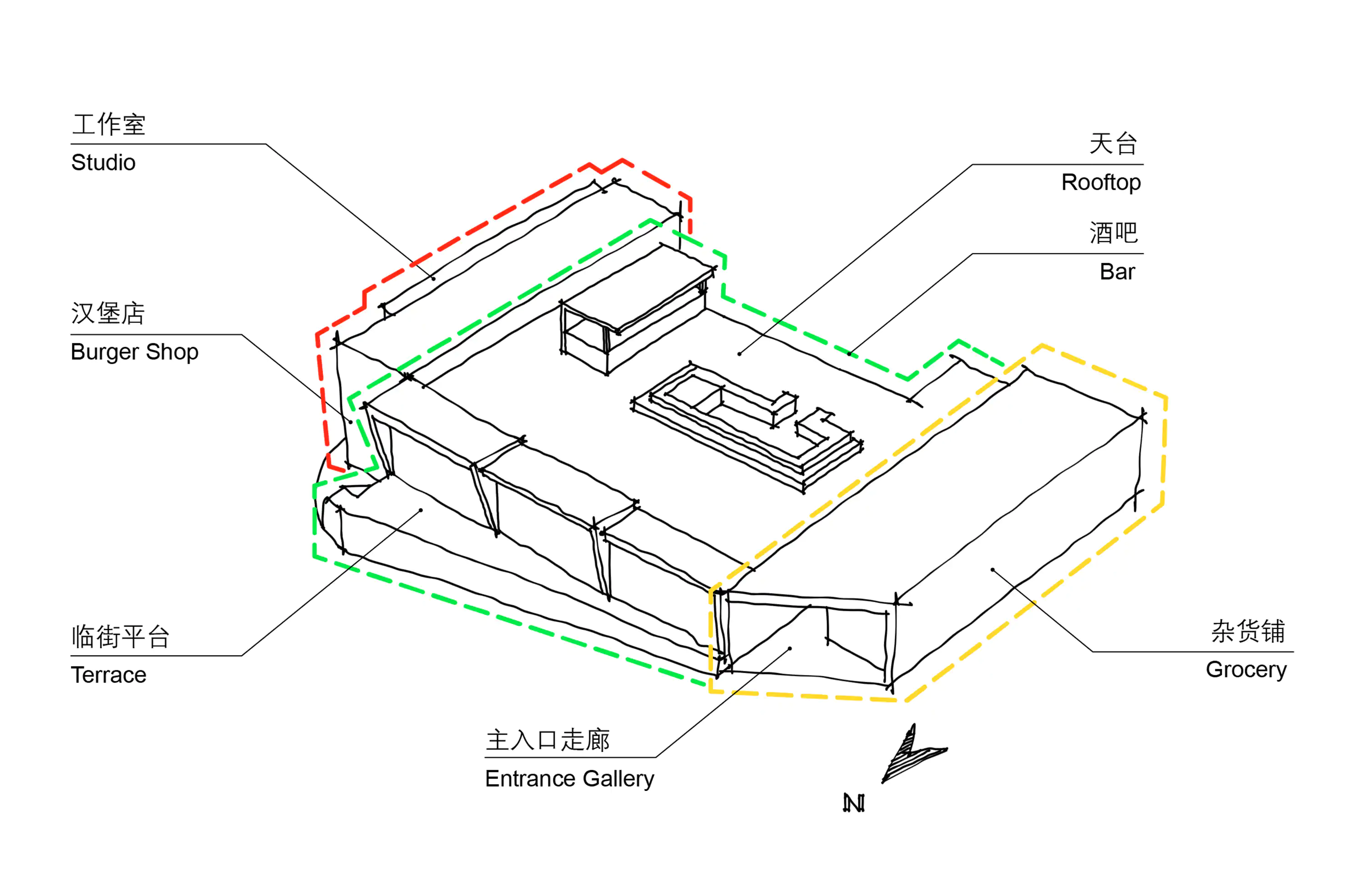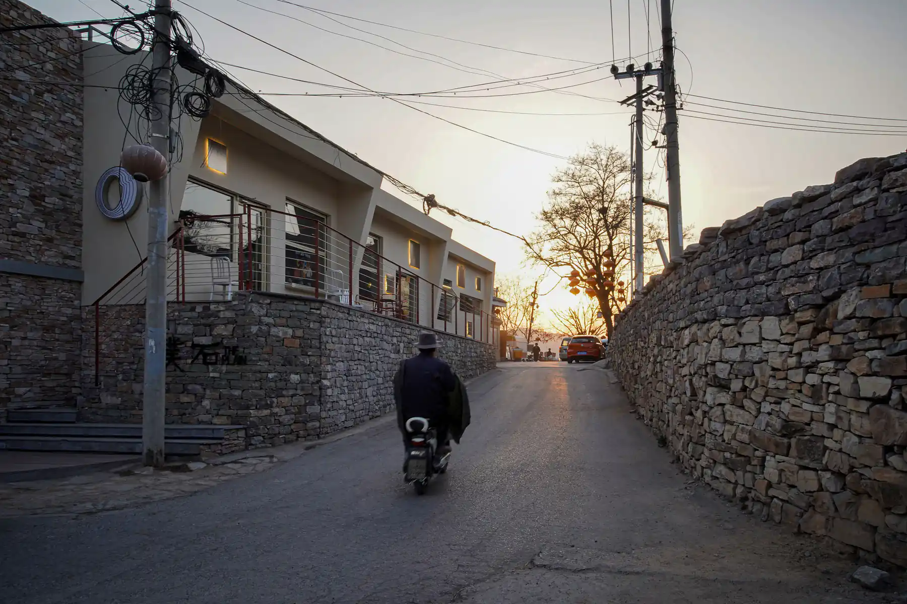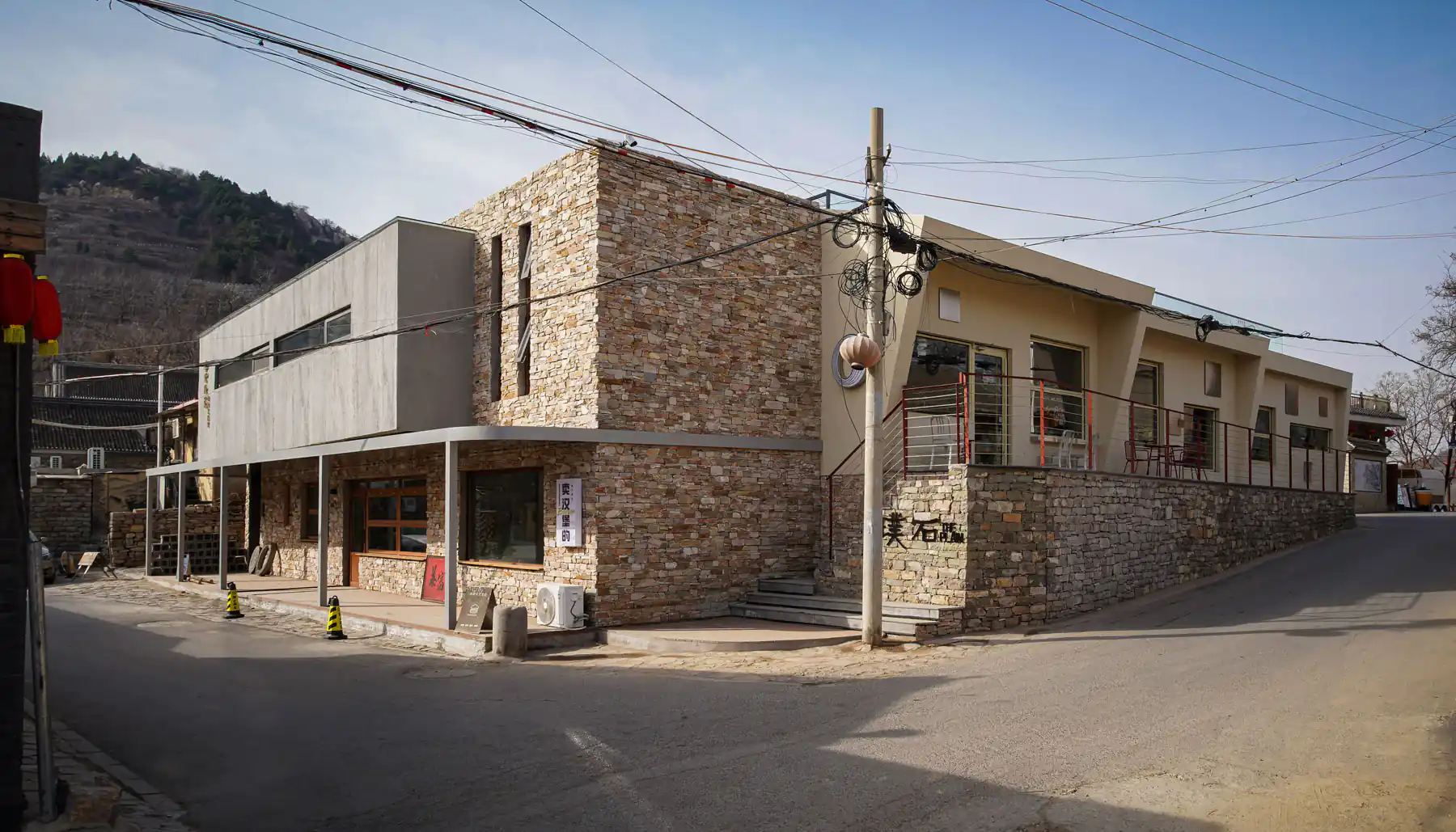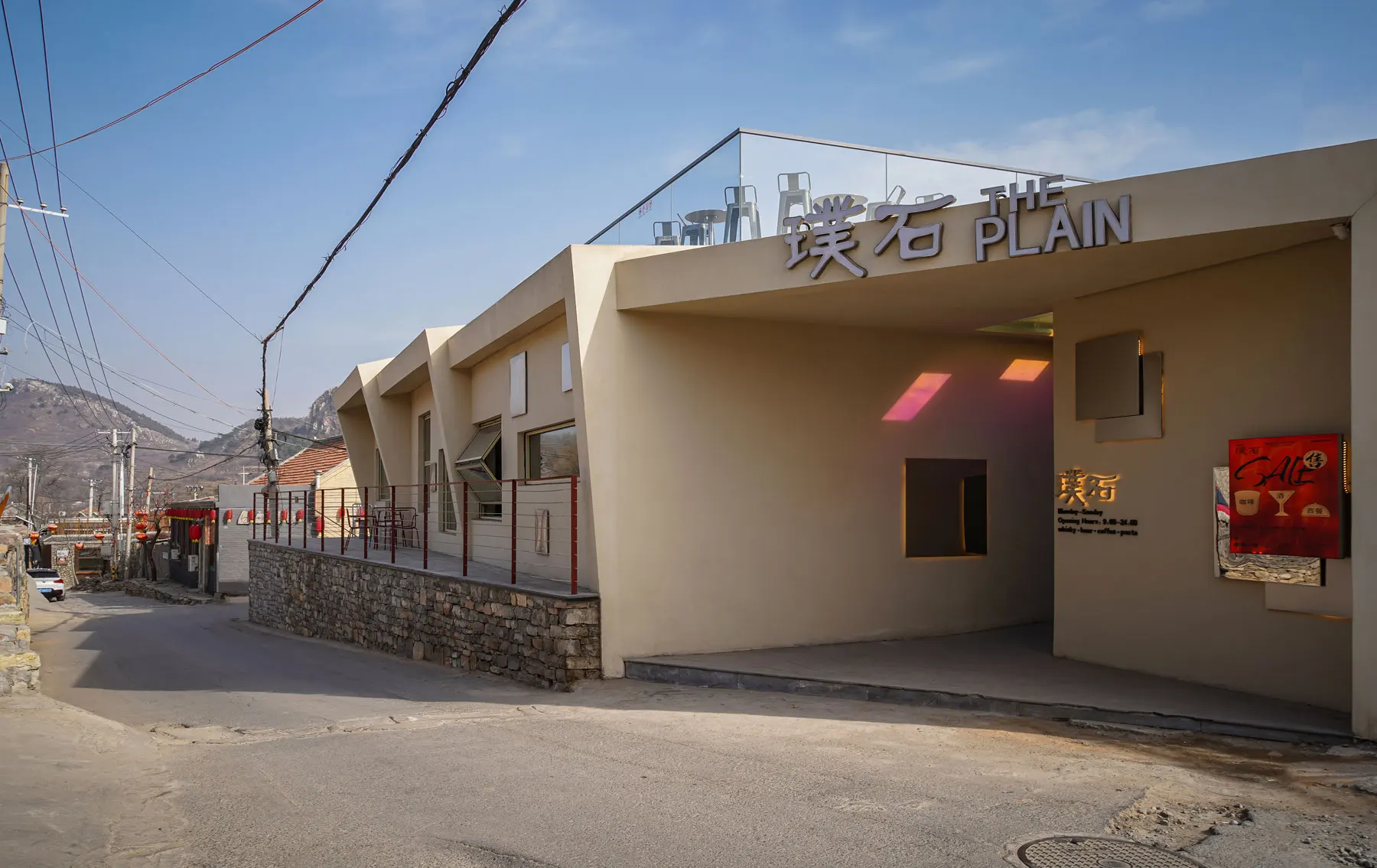 业主寻得了村落中一处现存民居,希望将其改造为一座区别于村落中现有业态的建筑——酒吧。在业主的脑海中,这座建筑是具有一定艺术性的现代风格酒吧,同时设计上也需要结合西井峪石头村的当地元素——由页岩、白云岩砌成的石头墙。功能上,业主希望这座建筑以酒吧为主,辅以杂货铺、汉堡店、工作室、屋顶天台等功能区域。