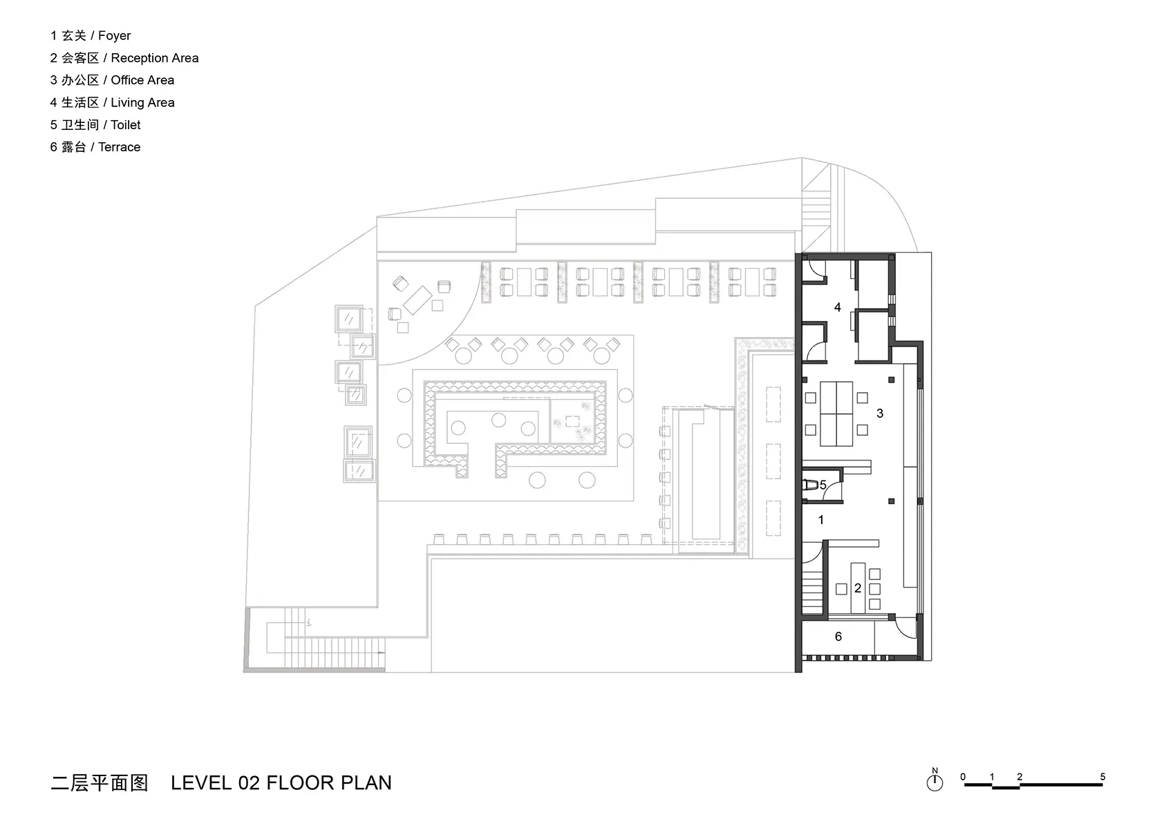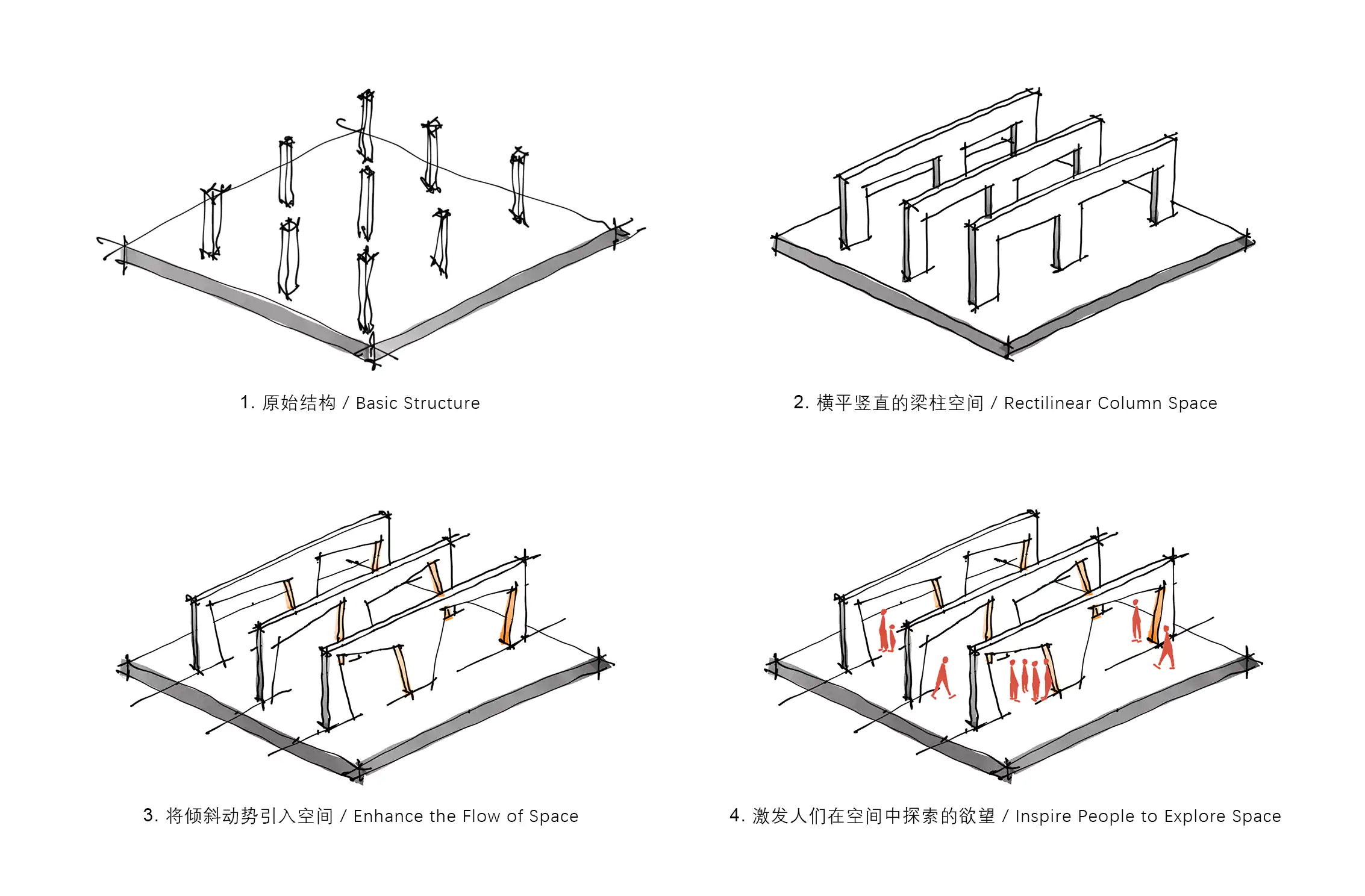 - 横平竖直的梁柱空间带给人规律感和秩序感,而保留了倾斜动势的梁柱空间,让处在其中的人们即使静止,视觉的触角也会向着因重叠而被遮挡的空间中延伸。这种动势不仅创造了更有趣味的物理空间,同时也扩张了人们的心理空间,激发了人们在空间中探索的欲望。