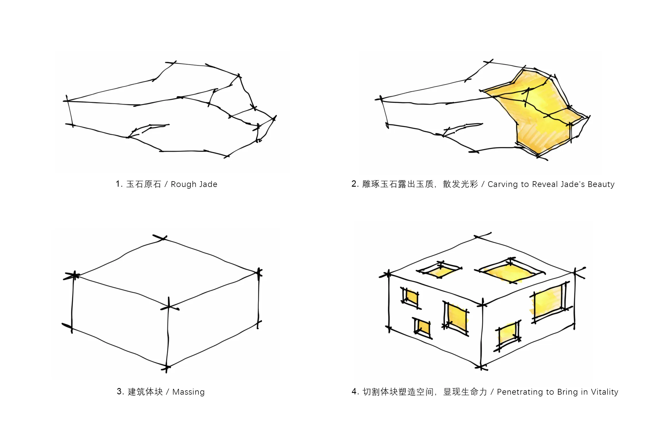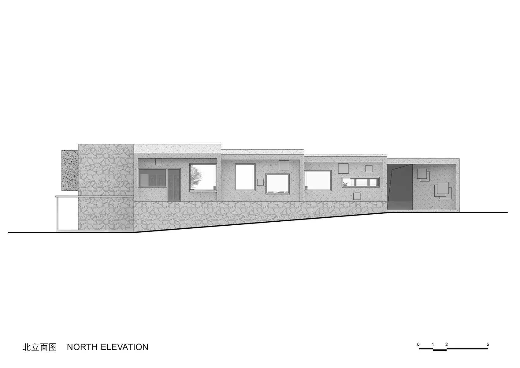- 业主将酒吧取名为“璞石”,这与我们对于建筑的思考一拍即合。玉石的雕琢与建筑的生成过程具有一致性。玉的美就藏在了石中,空间的美就藏在了建筑中。雕琢原石露出玉质,散发光彩;切割建筑体块塑造室内空间,显现生命力。《庄子·山木》中说,玉雕的最高境界是“既雕既琢,复归于朴”,经过一番雕琢,最终要回到质朴中去。这一点也是我们设计思想的真实写照。我们希望这座建筑能够根植于当地环境,使用当地材料,做简单而有效的建筑表达。