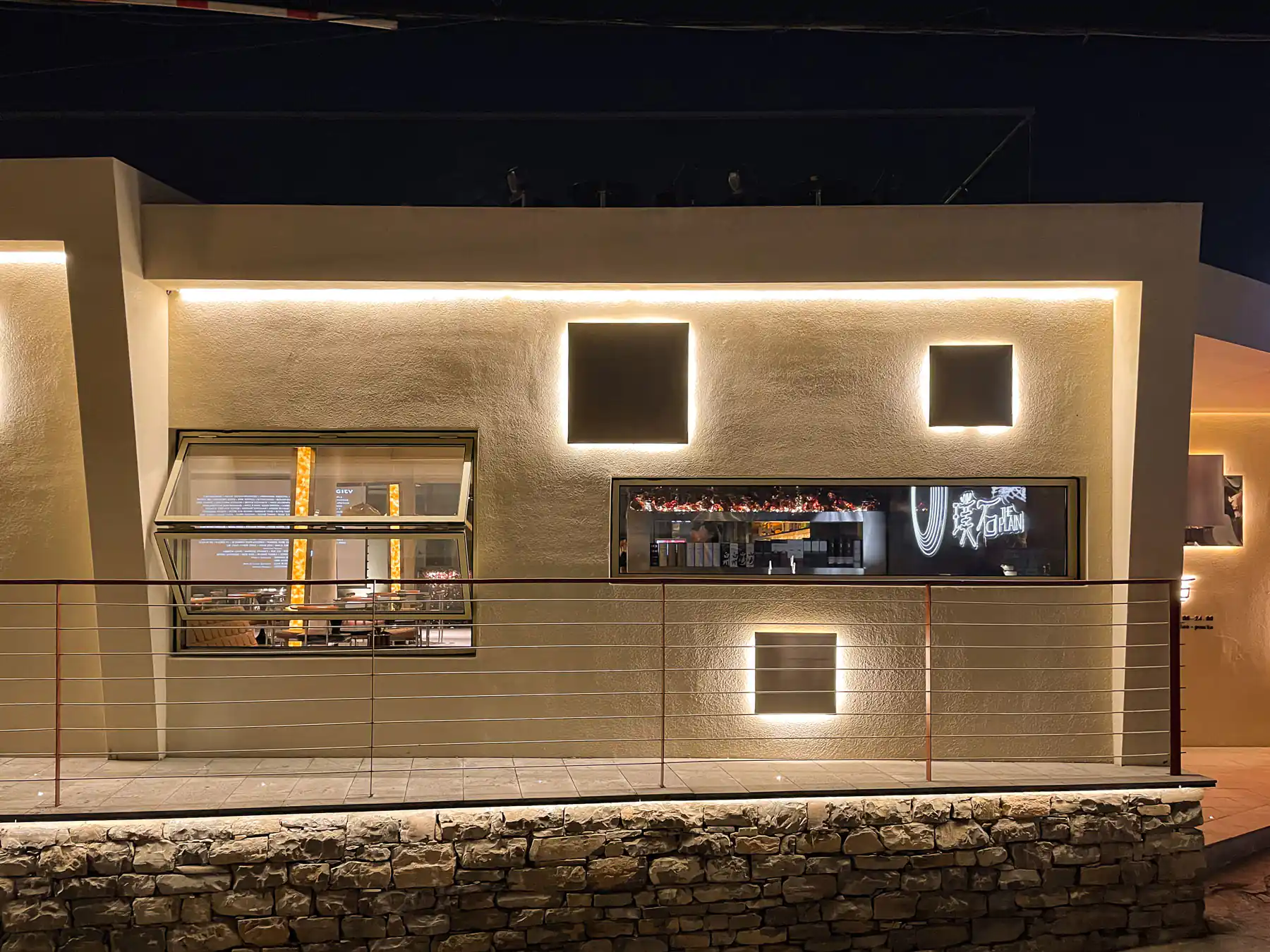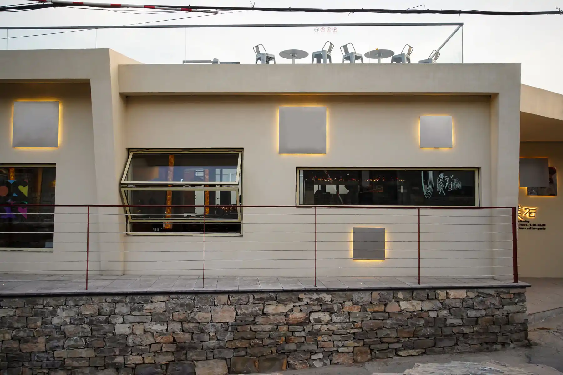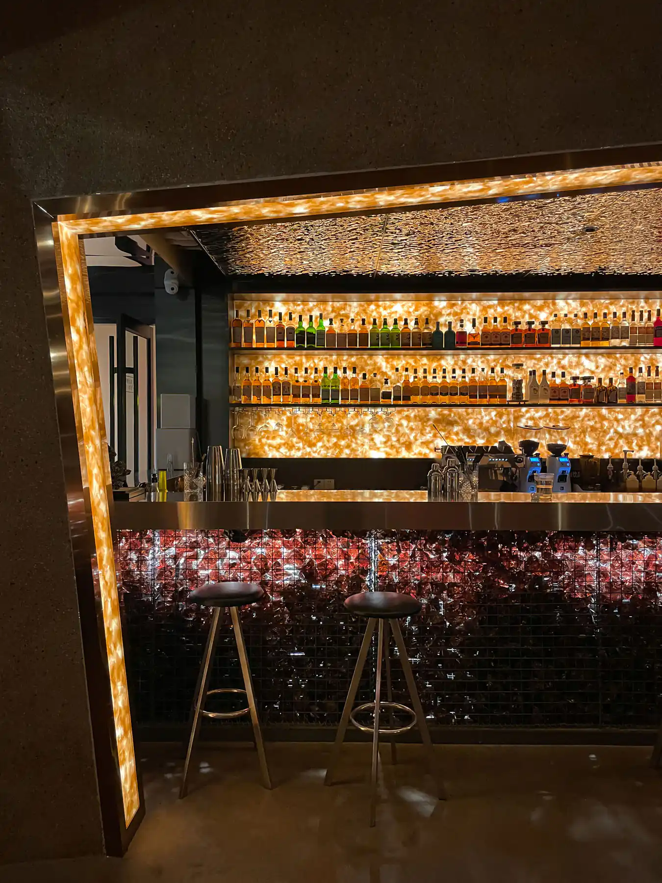 - 就地取材与使用回收材料是我们的主要策略。在本地材料中,我们选用了石板、豆石、砾石。使用石板做室内外铺地和墙面、豆石做水洗石墙面、砾石做庭院铺地。回收材料中,我们选用了红酒色回收玻璃石和啤酒色晶玉玻璃。两者在制作过程中都采用了一定比例的废旧酒瓶,经过高温融化或高温压制工艺,赋予回收材料新的肌理,物尽其用。而这些玻璃在室内都与灯光结合出现,暖光透过红酒色与啤酒色的玻璃散射到室内,使整个空间沉浸在舒适而沉醉的氛围中。
