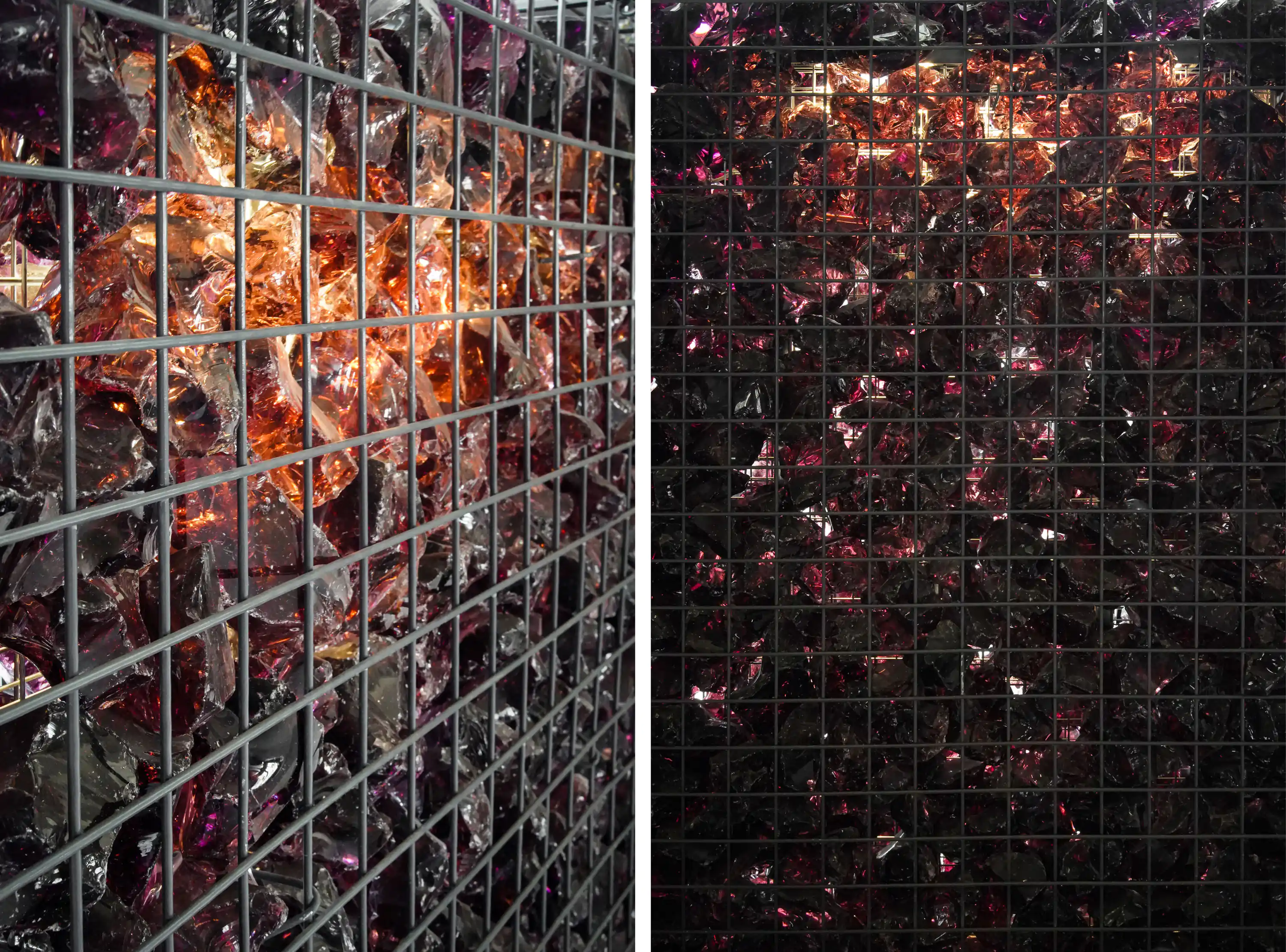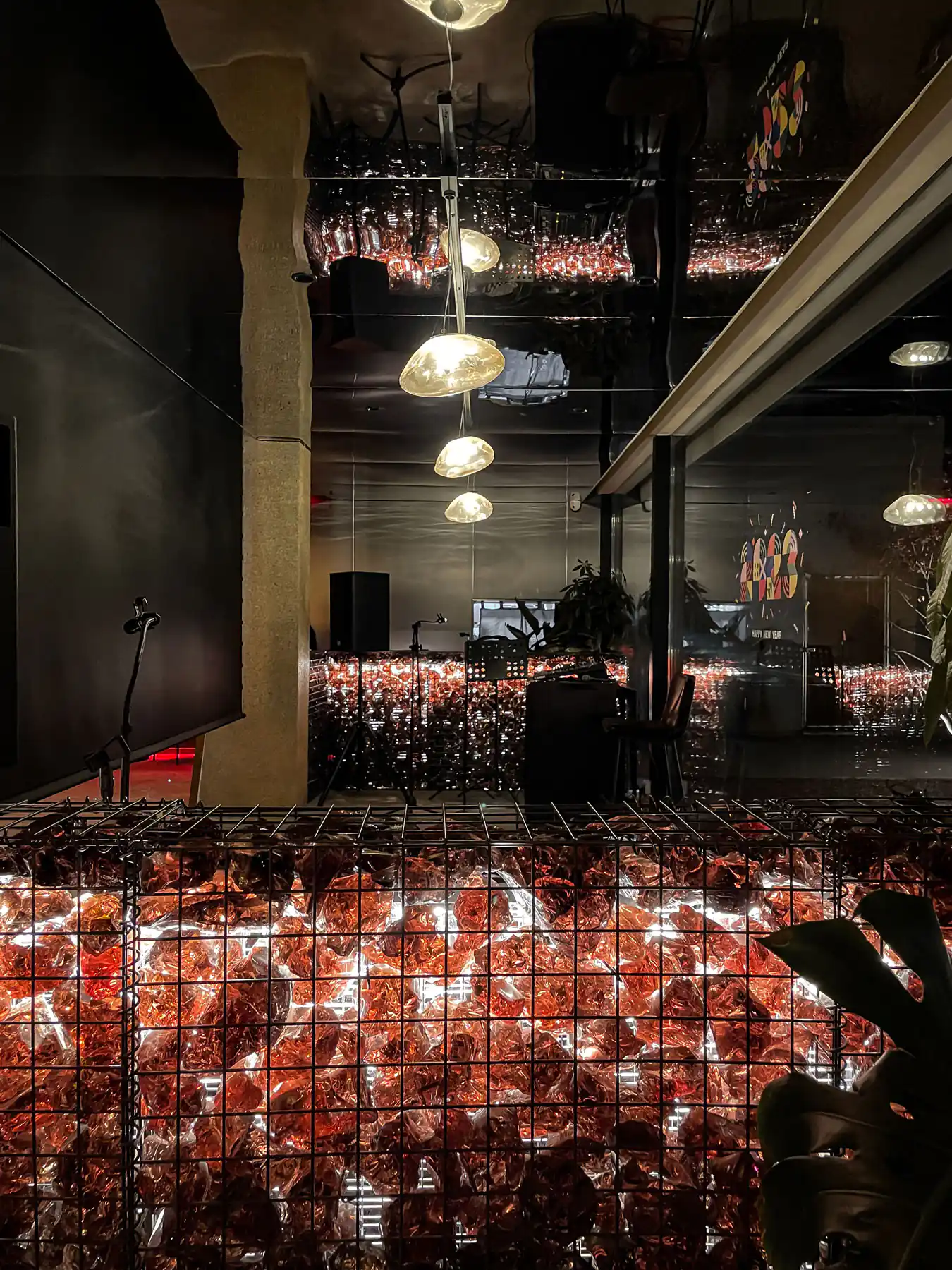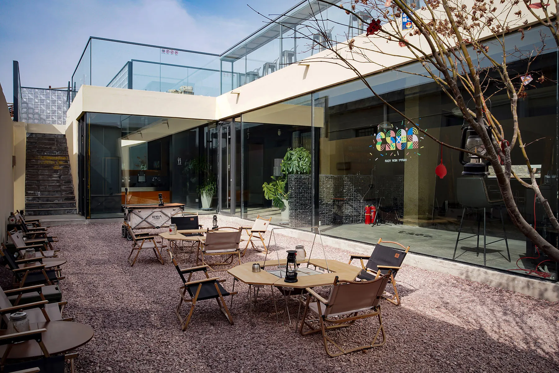 - 就地取材与使用回收材料是我们的主要策略。在本地材料中,我们选用了石板、豆石、砾石。使用石板做室内外铺地和墙面、豆石做水洗石墙面、砾石做庭院铺地。回收材料中,我们选用了红酒色回收玻璃石和啤酒色晶玉玻璃。两者在制作过程中都采用了一定比例的废旧酒瓶,经过高温融化或高温压制工艺,赋予回收材料新的肌理,物尽其用。而这些玻璃在室内都与灯光结合出现,暖光透过红酒色与啤酒色的玻璃散射到室内,使整个空间沉浸在舒适而沉醉的氛围中。