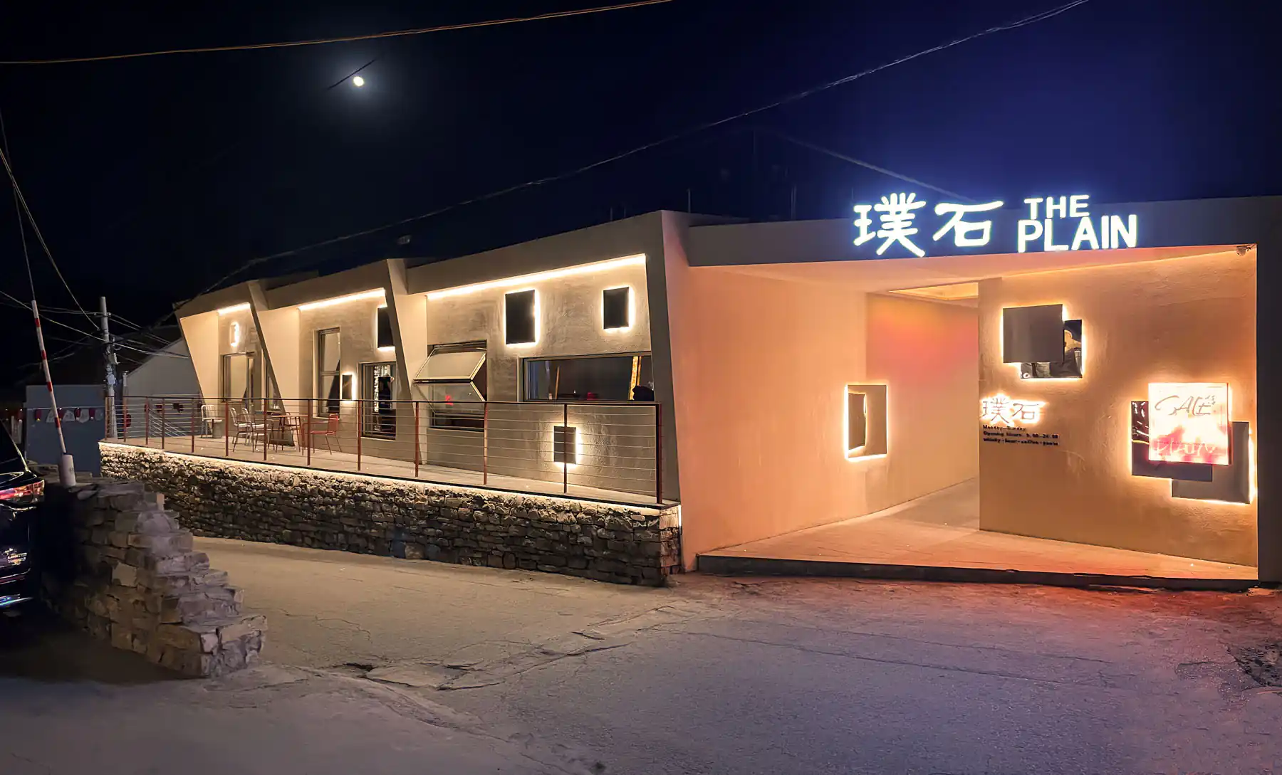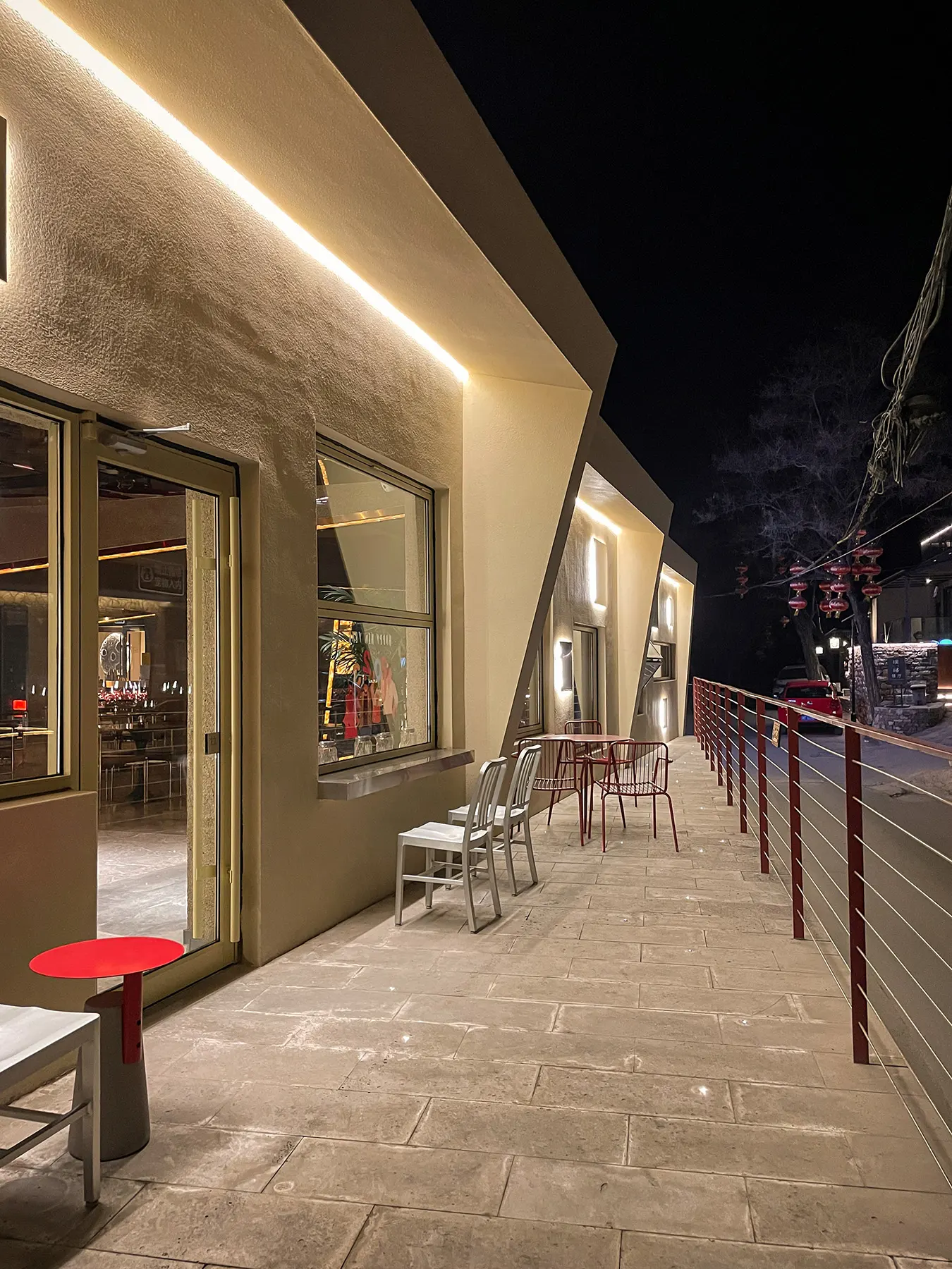 - 星光小径由矩形石板和当地岩板分段铺成,星光灯从入口走廊和临街平台延申至室内通道,它们将户外感和星光一并带入酒吧。夜幕降临,繁星点点。嵌入在小径中的星光灯闪闪烁烁,就像银河洒在地上的星星。人们走上小径,踩着星光进入酒吧。