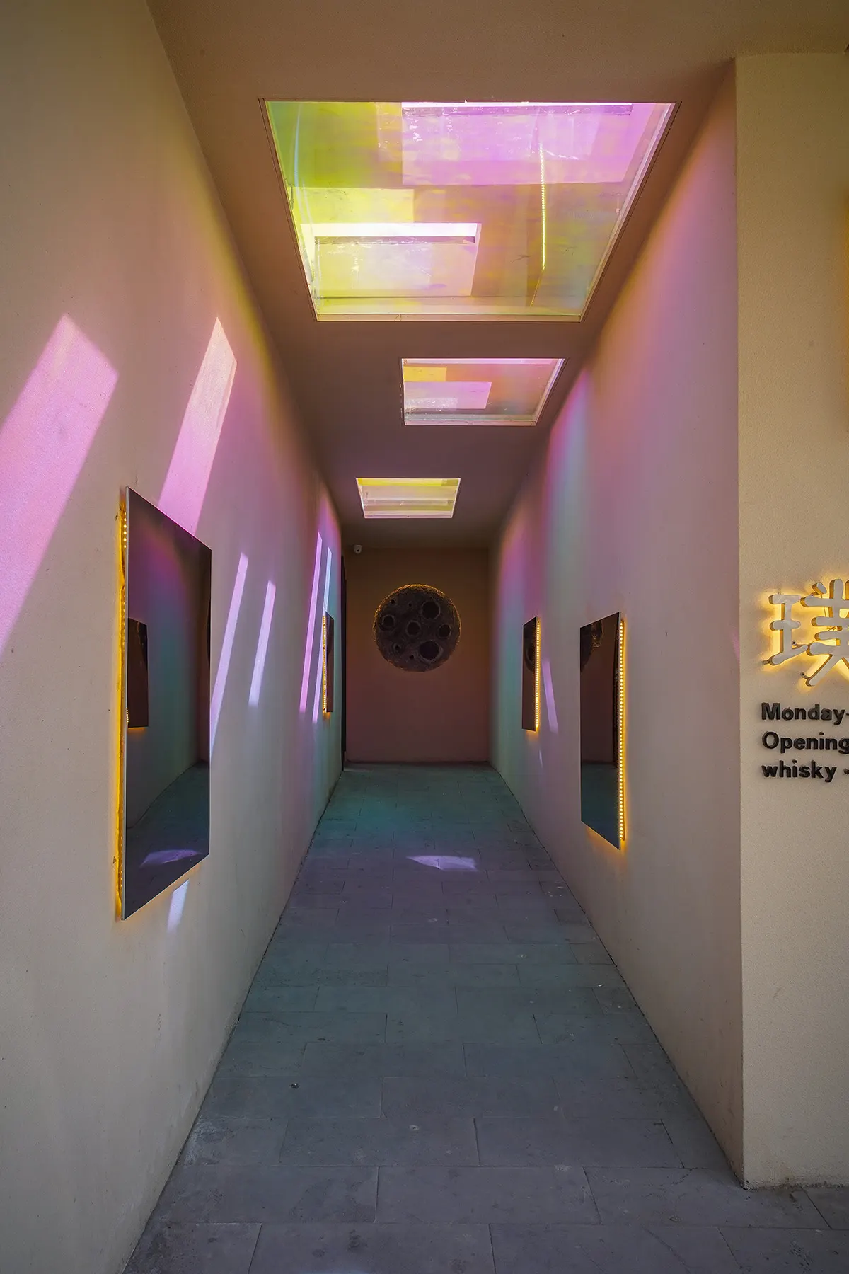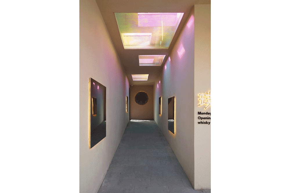 - 自然光透过炫彩玻璃天窗点亮了入口走廊。阳光洒在墙壁上,两侧高低错落的镜面不锈钢板将光反射到廊道中,直射光与反射光交相投射,随着阳光的移动形成了多样化的光影效果。在走廊中行进的人们,望向镜面时也会因为角度的不同和镜面之间的多重反射,而看到不停变换的有趣景色。