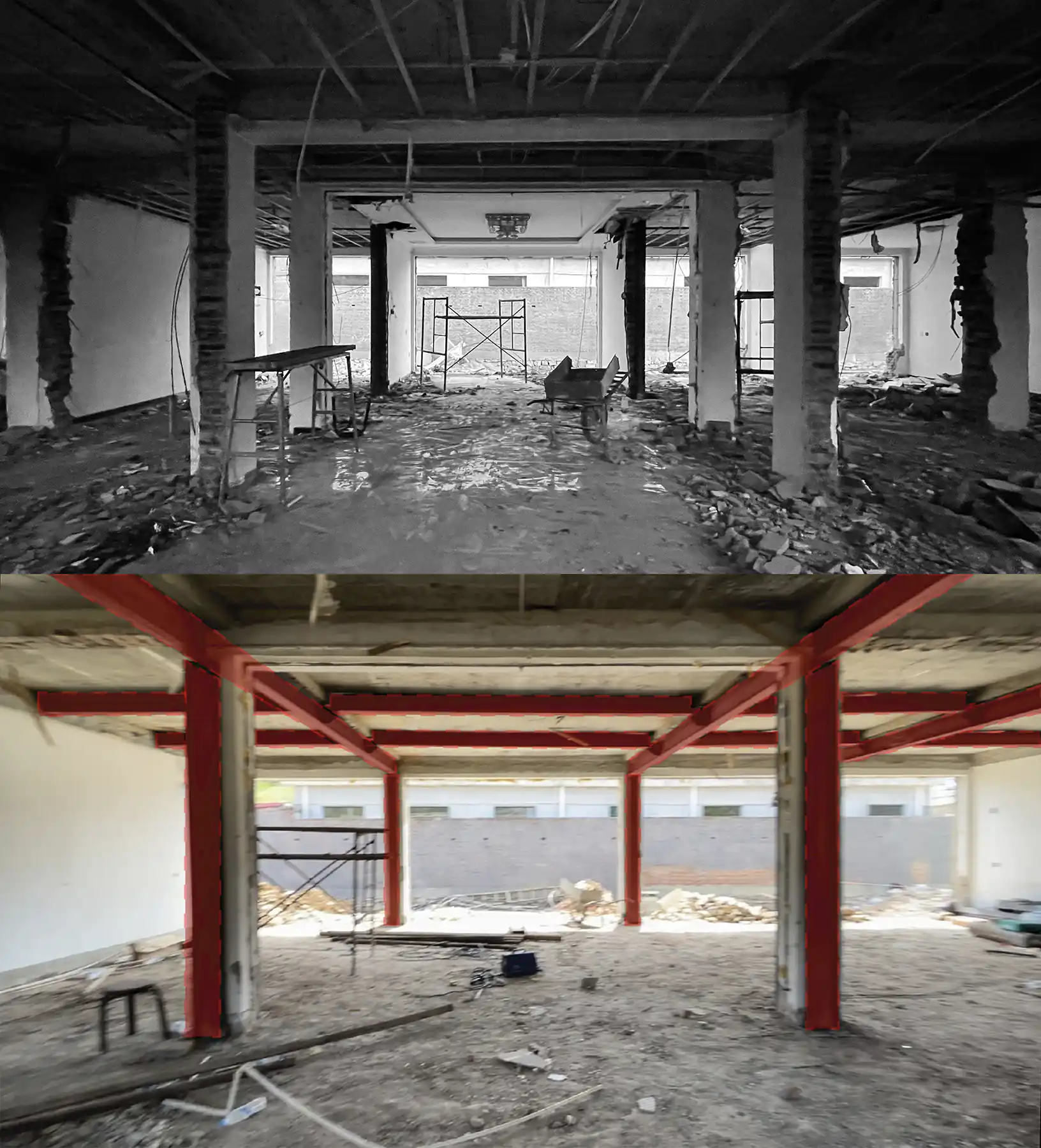 - 我们保留了建筑物原有的主要结构进行了改造更新。原建筑物为单层民居,建筑物围护结构拆除之后,有两个问题凸显出来:室内柱多,结构倾斜。首先,建筑物原结构为砖混结构,竖向承重构件为砖墙和构造柱,楼板为钢筋混凝土楼板。建筑物原功能为民居,开间与进深较为狭窄,拆除了一部分非承重墙体后结构密集,不适宜直接改造为开敞的公共空间使用;其次,因为乡村自建房原施工质量不算优秀,部分墙柱在多年使用之后存在一定程度的倾斜。鉴于此,我们采用了附加的钢结构体系对原有结构进行整体加固,消除了安全隐患,并尽可能移除大片连续的室内砖墙,减少原有墙体对于空间的切割,创造开敞并具有品质的空间。